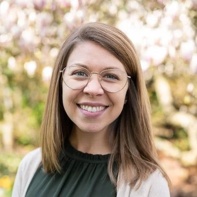 Woman smiling outdoors with glasses and brown hair, wearing a green top and beige cardigan; blurred floral background.