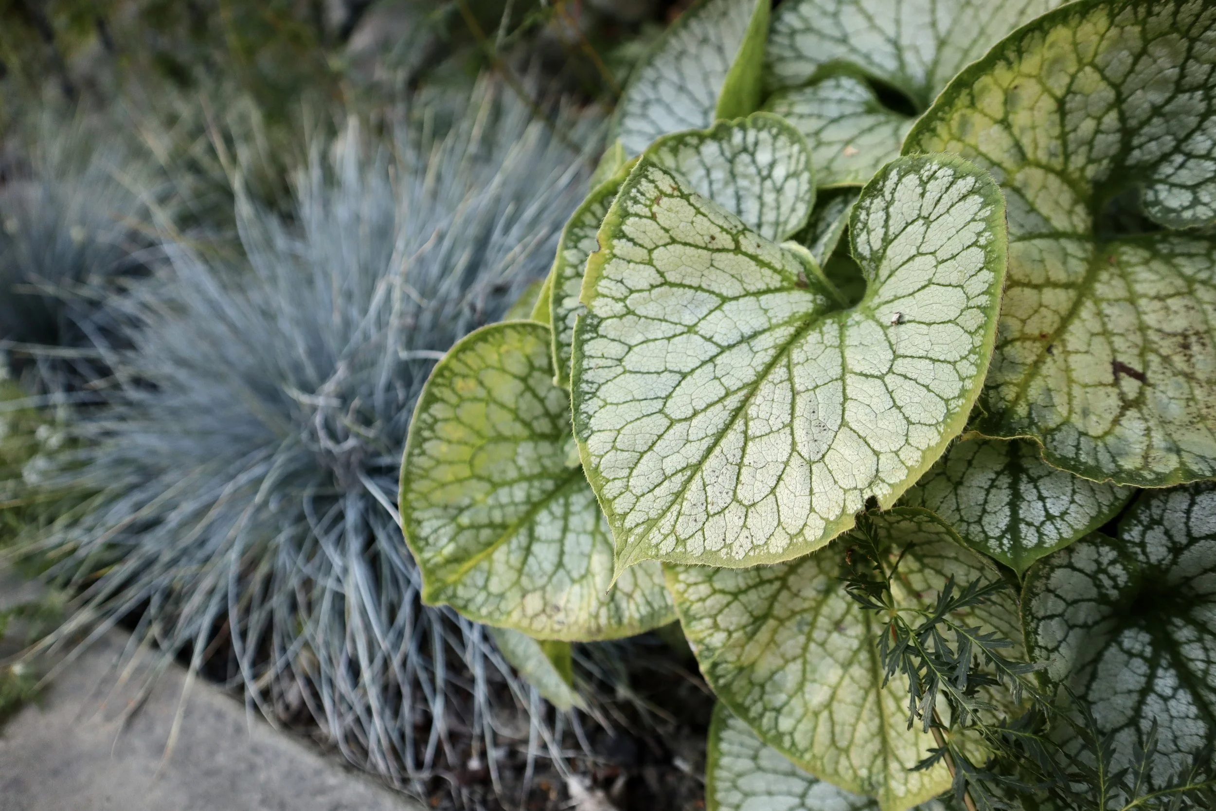 Close-up of textured, heart-shaped green leaves with white veining, alongside spiky ornamental grass.